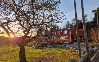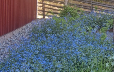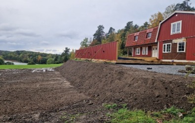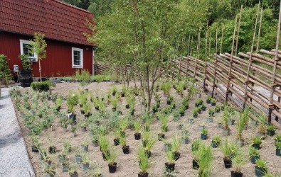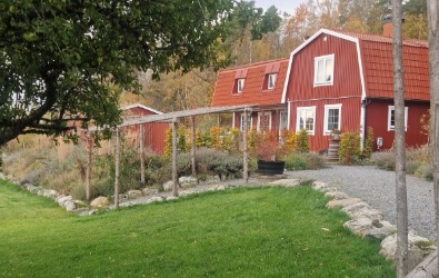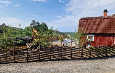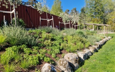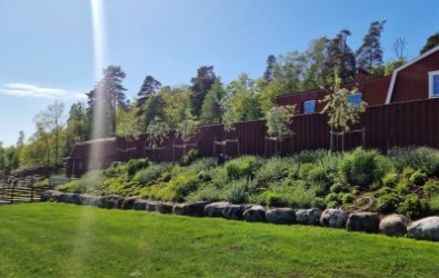 Paret hade hittat drömfastigheten och påbörjat den omfattande renoveringen invändigt och hunnit bygga en pool med ett plank som insynsskydd. Nu var där bara en lervälling och en brant slänt ned till hundrastgården. Vi hägnade in tomten med en gärdesgård och planade ut slänten med natursten innan en vacker perenn äng anlades i olika lila och silvriga nyanser. Vi skapade insynsskydd i flera lager med bokhäckar, körsbärsträd och magnolia och portaler av granstörar som snart kläs in med vildvin till en mjuk passage ned till hundrastgården.