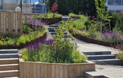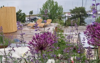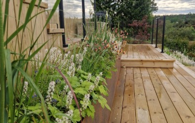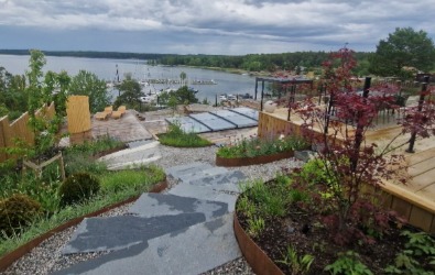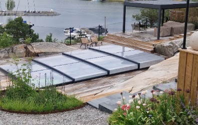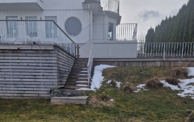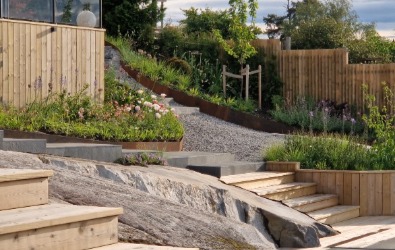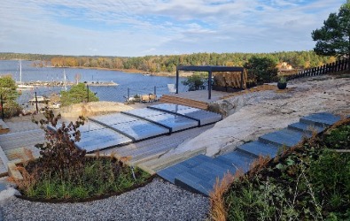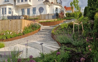 En tomt högt belägen ovan havet med milsvid utsikt. Ursprungsläget var en gammal altan med smala rangliga trappor som gjorde det svårt att ta sig ned på tomten vilket gjorde att den aldrig användes. Familjen önskade sig en helt ny trädgård med pool längst ned och vackra planteringar utan smala trappor.